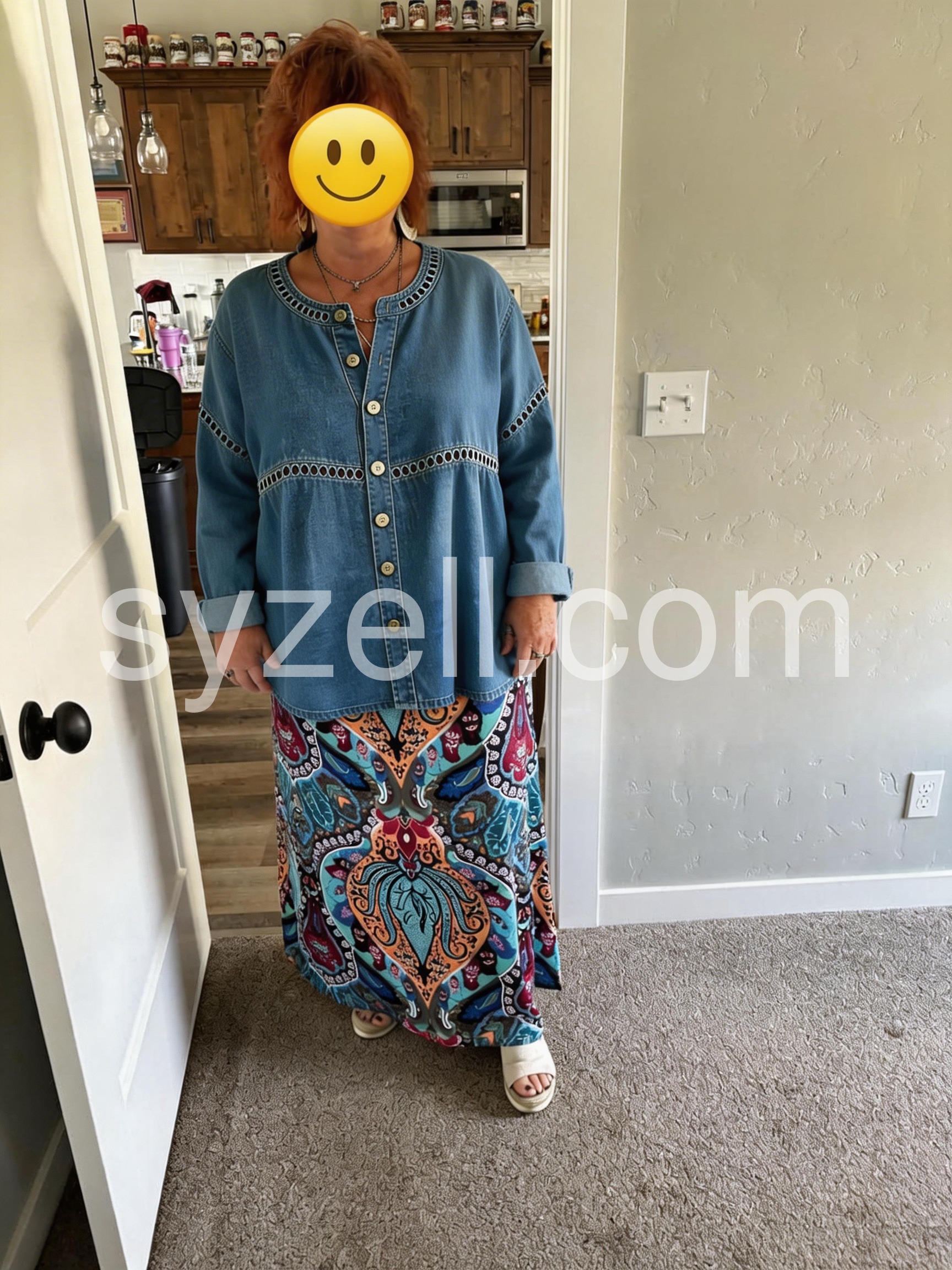 Embrace laid-back elegance in this Blue Denim Button Down Top with Embroidered Trim, a stylish and comfortable piece that blends classic denim appeal with artisanal details. Crafted from soft, medium-wash denim fabric, this tunic features a relaxed, oversized silhouette with a flattering round neckline and front button closure, offering both ease and timeless charm. The standout design element is the decorative embroidered trim—featuring a delicate dotted pattern—accenting the neckline and waistline, adding a touch of boho flair and texture. Styled here with layered necklaces, bracelets, and distressed denim bottoms, it’s ideal for weekend errands, coffee dates, or a leisurely walk through the city.