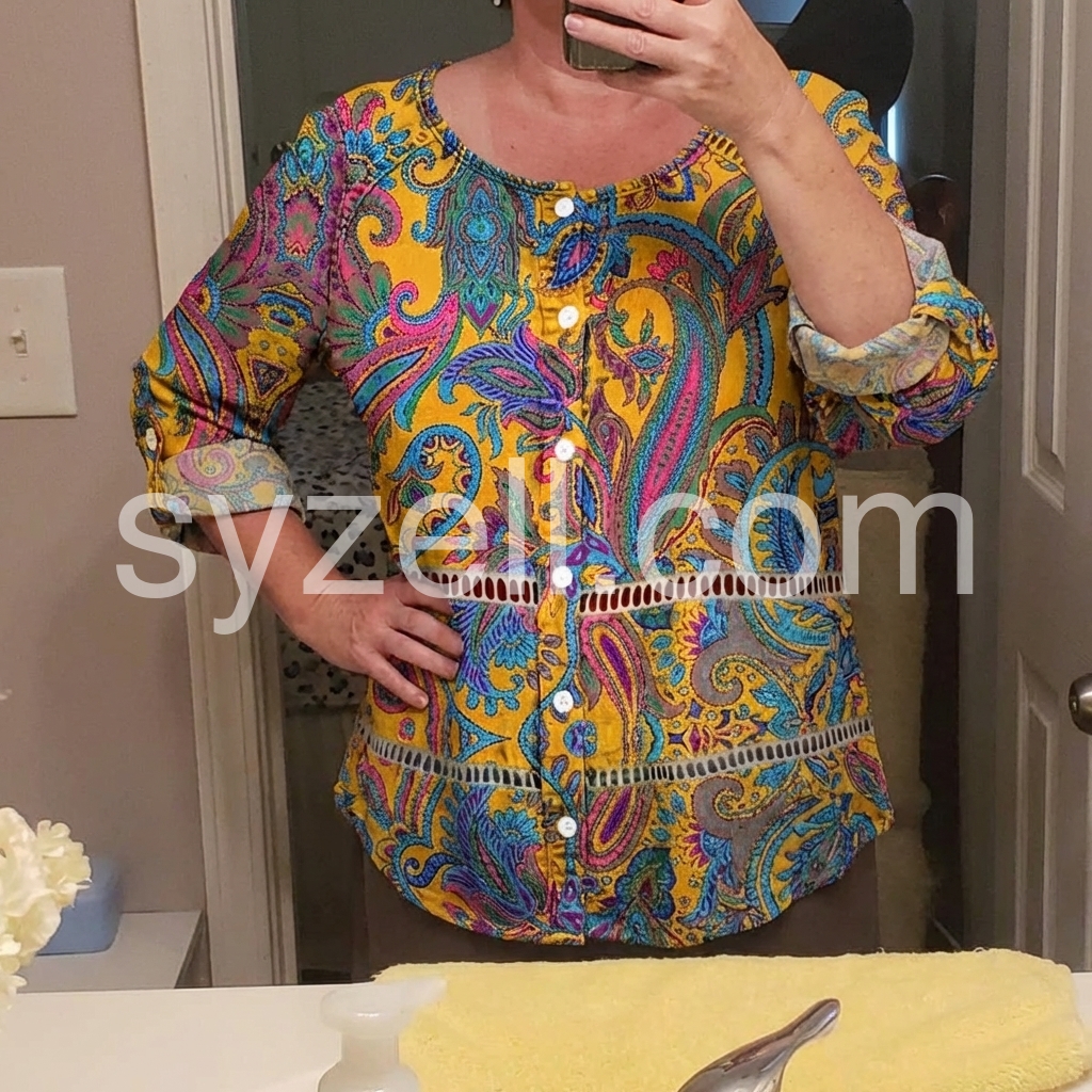 This long-sleeve tunic features a rich yellow base with colorful paisley patterns. The front button design adds vintage charm. Relaxed fit and rolled sleeves for comfort. Perfect for casual wear or bohemian styles. Pair with jeans or leggings for effortless flair.