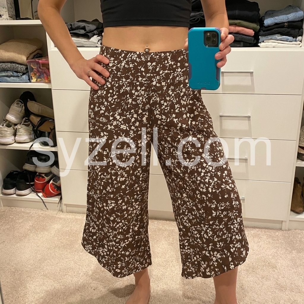 These pants are absolutely perfect for summer! The material is incredibly lightweight and breezy. I love the dark brown floral pattern, it goes with so many of my white tank tops. Highly recommend!