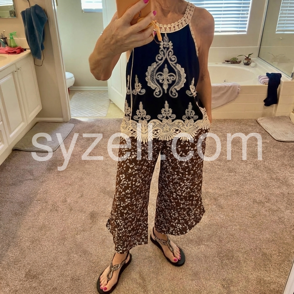 These high-waisted culottes feature a delicate white floral print on a rich brown base. Wide-leg design with an asymmetrical hem for a stylish flair. Elastic waistband for comfort and ease. Lightweight fabric perfect for warm weather. Ideal for casual outings or boho-chic looks.