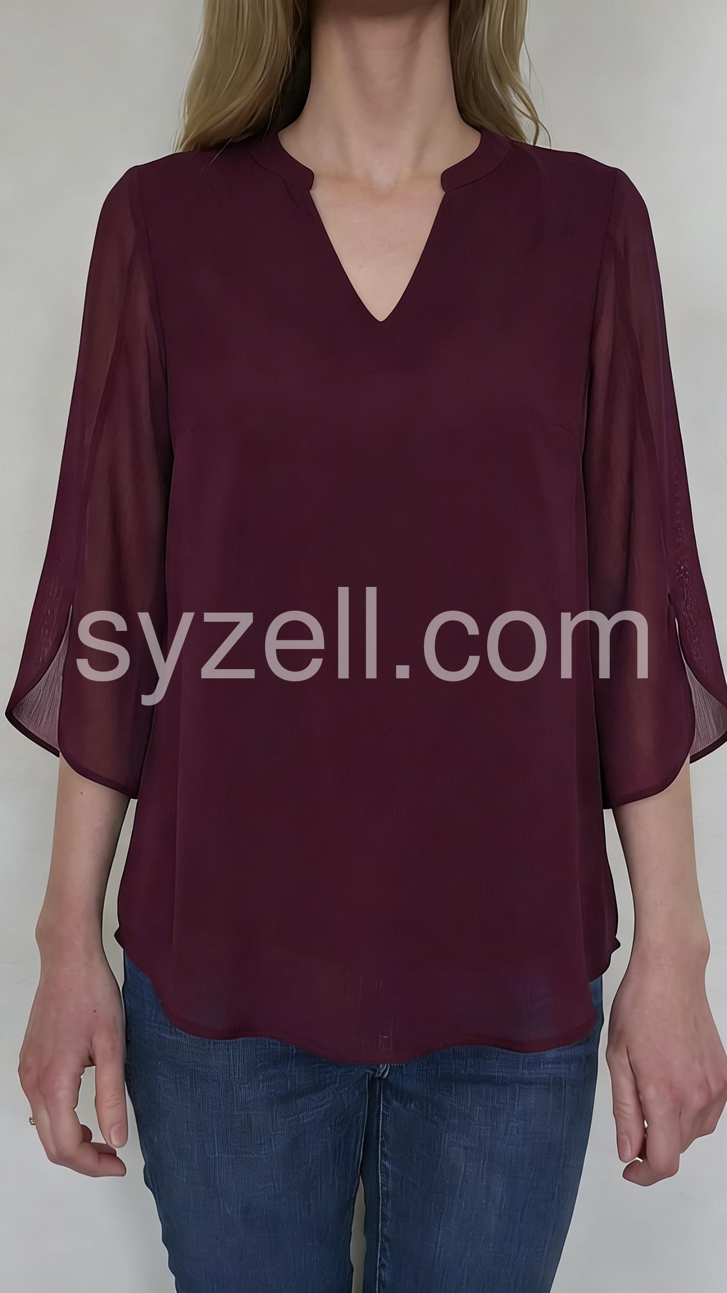 Burgundy 3/4 Sleeve Plain Chiffon Top