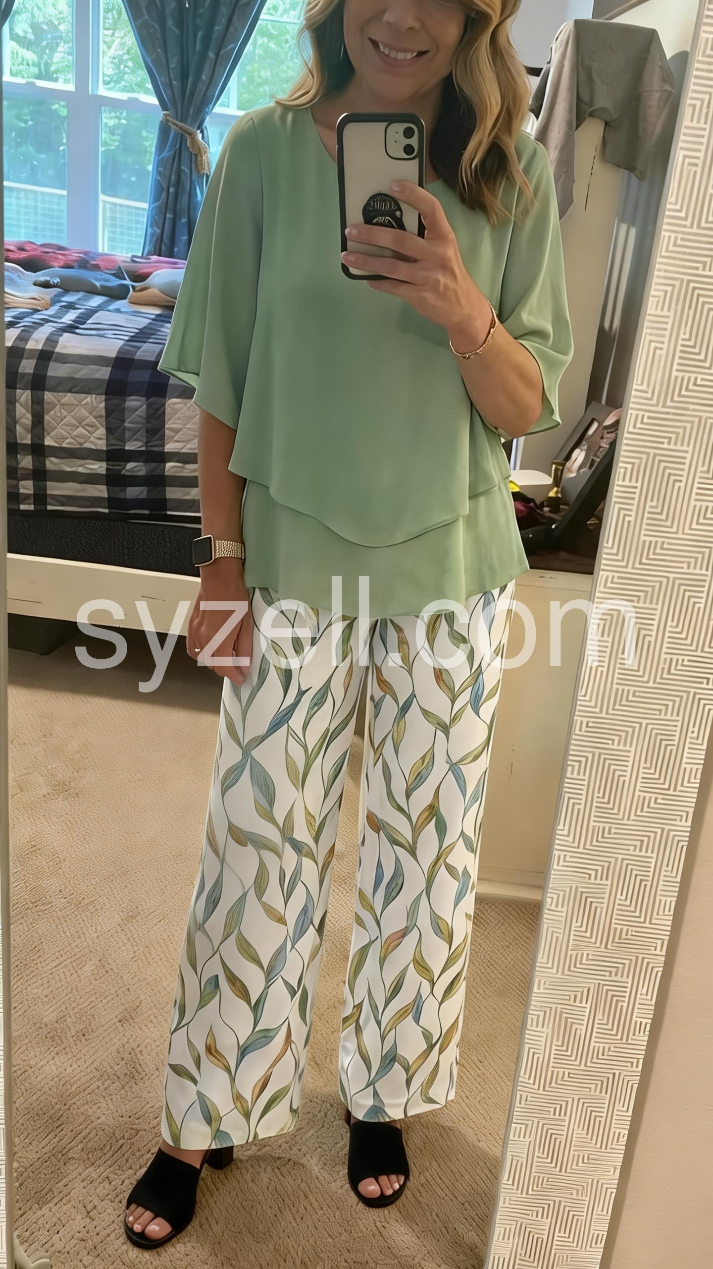 This two-piece outfit features a flowy green layered top with batwing sleeves. Paired with wide-leg pants in a soft leaf print. Lightweight and breathable fabric for all-day comfort. Perfect for casual outings or stylish everyday wear. Effortlessly chic and flattering.