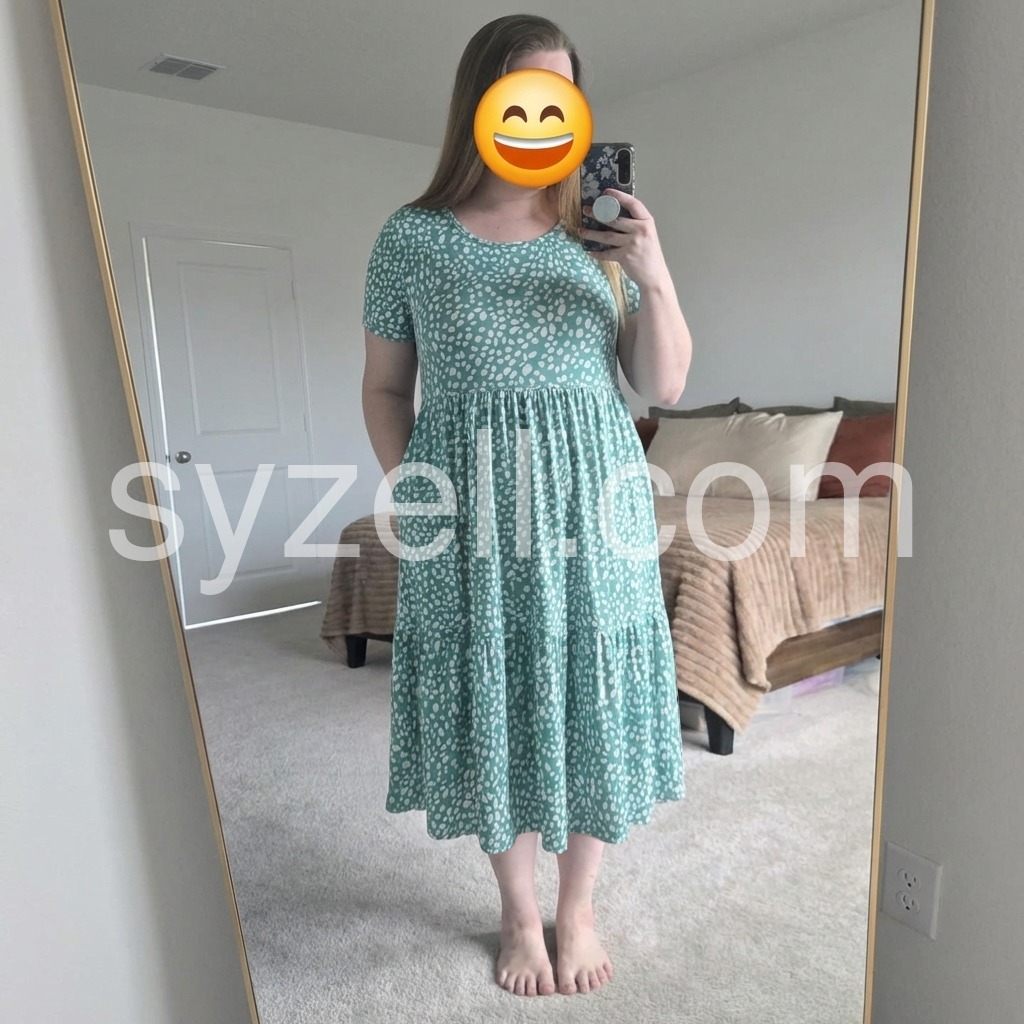 Such a great find! The midi length is perfect for me hitting right below the knee. The short sleeves provide just the right amount of coverage. The fabric is light and breathable, perfect for hot weather but not see-through at all.