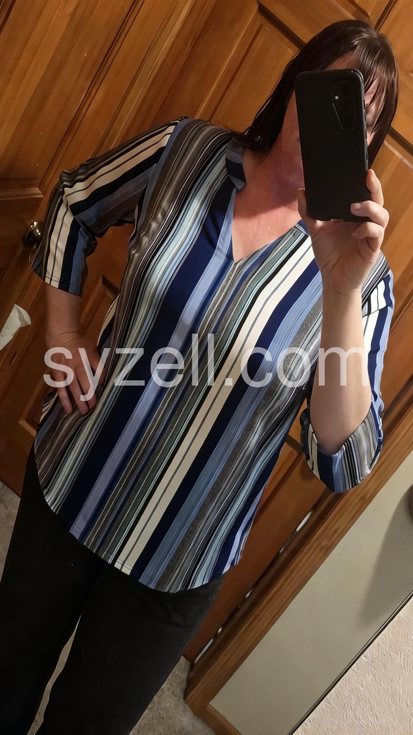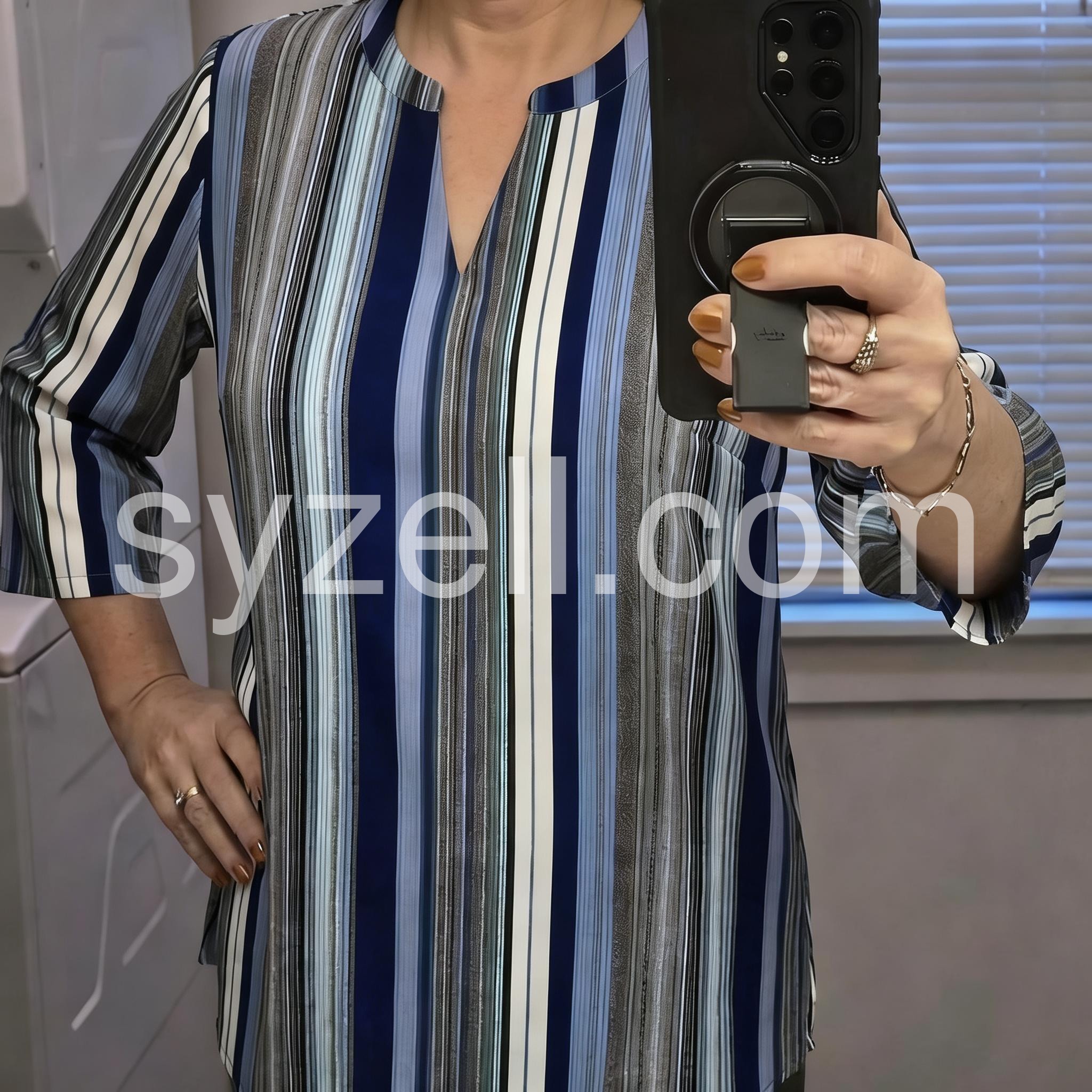 This loose-fitting top features vertical stripes in navy, blue, white, and gray for a modern look. The V-neck design adds a touch of elegance. Three-quarter sleeves with rolled cuffs offer comfort and style. Perfect for pairing with jeans or pants. Effortlessly chic for everyday wear.