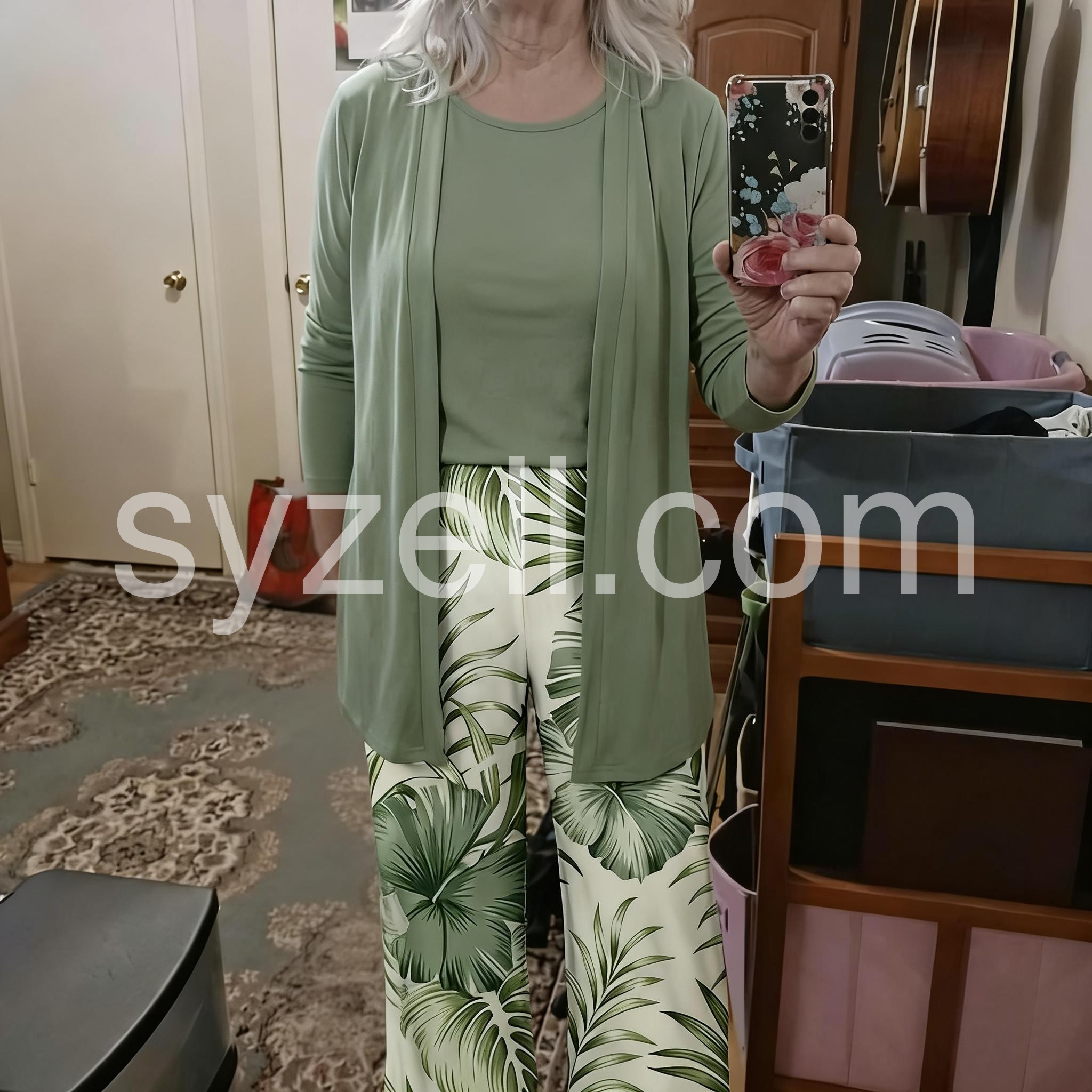 Beautiful outfit! The tropical leaf print on the pants is so vibrant and matches the solid sage green top exactly. It feels like wearing pajamas but looks chic and put together. Washing it was a breeze, no shrinking.