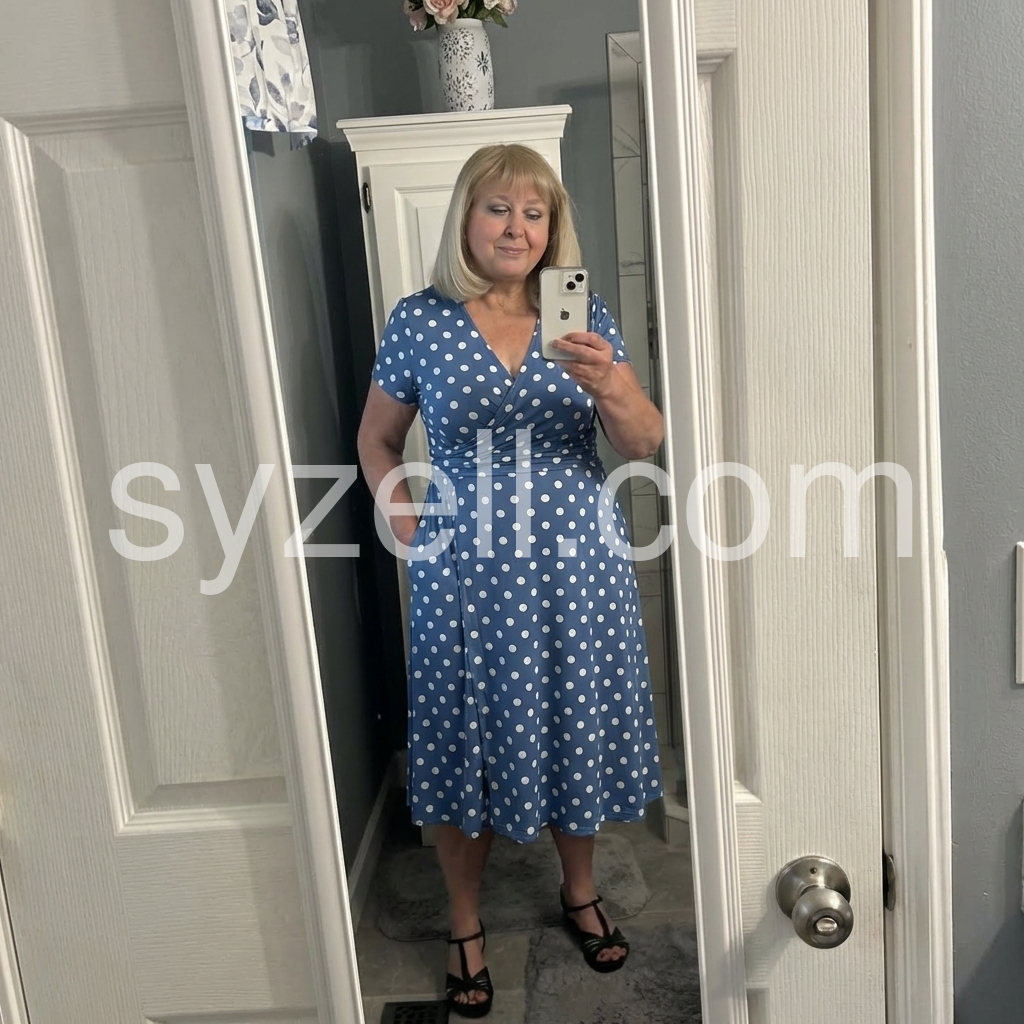 This mid-length wrap dress features a chic blue base with white polka dots. V-neckline and short sleeves for a timeless look. Fitted waist with flared skirt for a flattering silhouette. Perfect for beach outings or casual events. Sophisticated and effortless style.