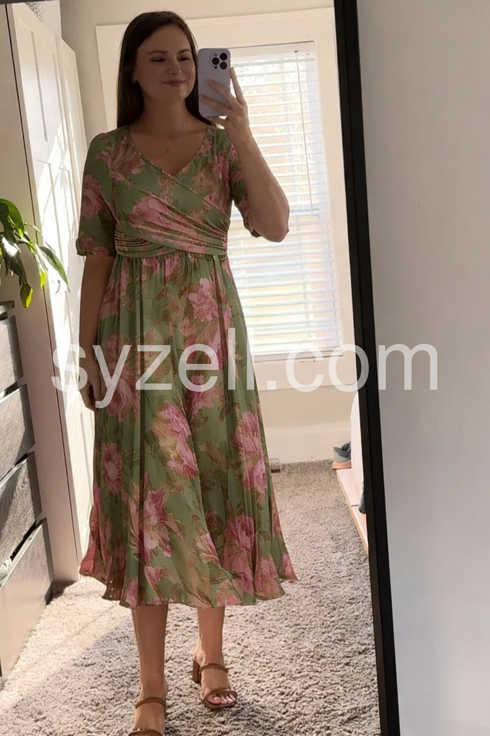 I absolutely love this dress! The sage green color with large pink flowers is so pretty for spring. Best part? It has pockets! The material is lightweight and flowy, perfect for a warm afternoon.