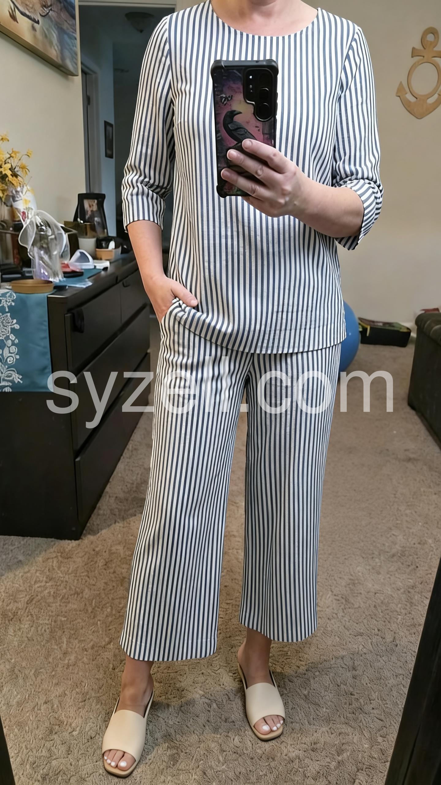 Absolutely stunning! The vertical lines are so slimming. It feels like wearing cozy pajamas but looks like you are ready for a fancy resort vacation. I will be buying it in other colors if available!