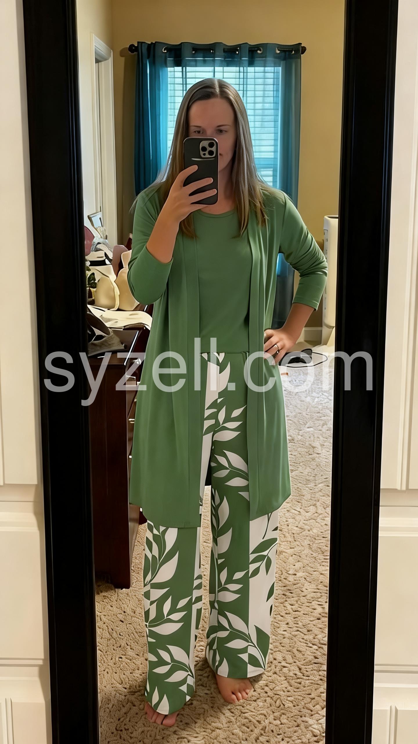 This three-piece set features leaf-patterned wide-leg pants in white and green, paired with a solid green top and open-front cardigan. The relaxed fit offers comfort and elegance. Perfect for casual outings or smart-casual events. Lightweight fabric ideal for warm weather. Effortlessly chic and easy to wear.