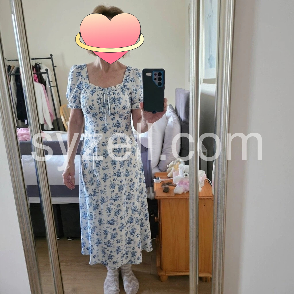 This dress is so pretty! The blue floral print is delicate and looks exactly like the photos. The puff sleeves are cute and make it feel more special. The fabric hangs nicely and the length is perfect for a comfortable midi fit. Overall, it’s well-made, fits well, and is a great purchase.