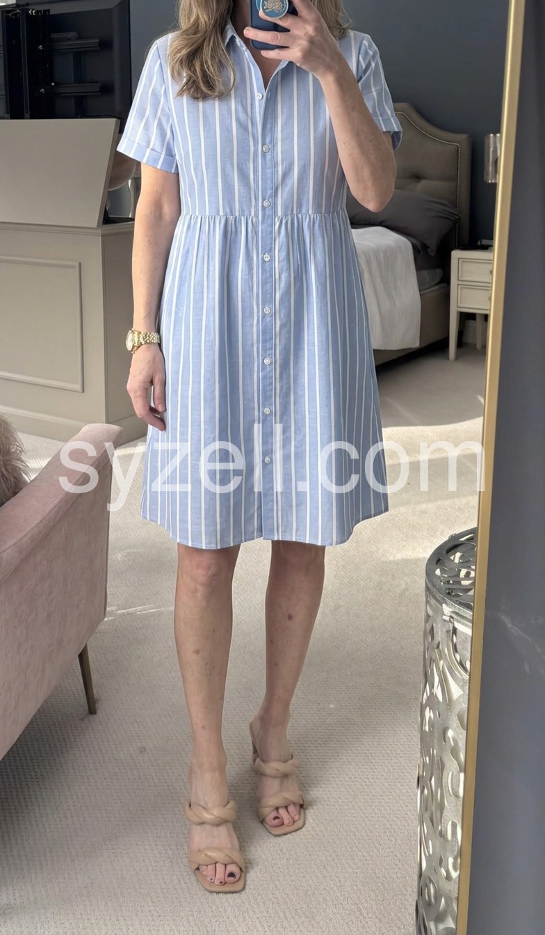 This light blue striped shirt dress features a crisp vertical pattern with short sleeves and a classic collar. The front button closure and relaxed fit offer comfort and style. An asymmetrical hem adds a modern touch, perfect for casual summer days. Ideal for beach outings, brunches, or everyday wear. Lightweight and breathable fabric enhances its effortless charm.