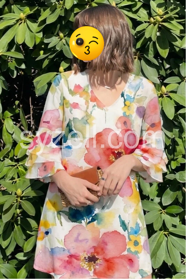 This floral dress features a soft watercolor print with vibrant pink, red, and blue blooms on a light background. The V-neckline and flared sleeves add a romantic touch. Loose, relaxed fit ensures comfort and ease. Perfect for spring outings, brunches, or beach days. Lightweight fabric flows beautifully for a breezy, effortless look.