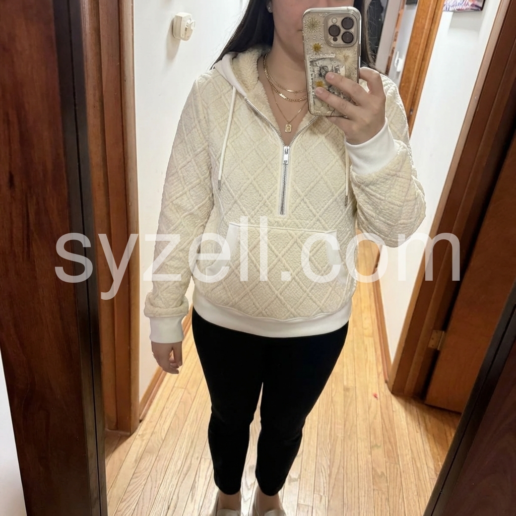 Elevate your casual wardrobe with this sophisticated beige quilted sherpa half-zip hooded sweater. The combination of quilted detailing and plush sherpa lining creates exceptional warmth without excess bulk, making it ideal for layering or wearing solo. The half-zip design offers versatile styling options and easy temperature adjustment, while the integrated hood provides additional coverage on cooler days. Perfect for transitional seasons or as a lightweight layering piece, this sweater balances comfort with refined aesthetics for the discerning wearer.