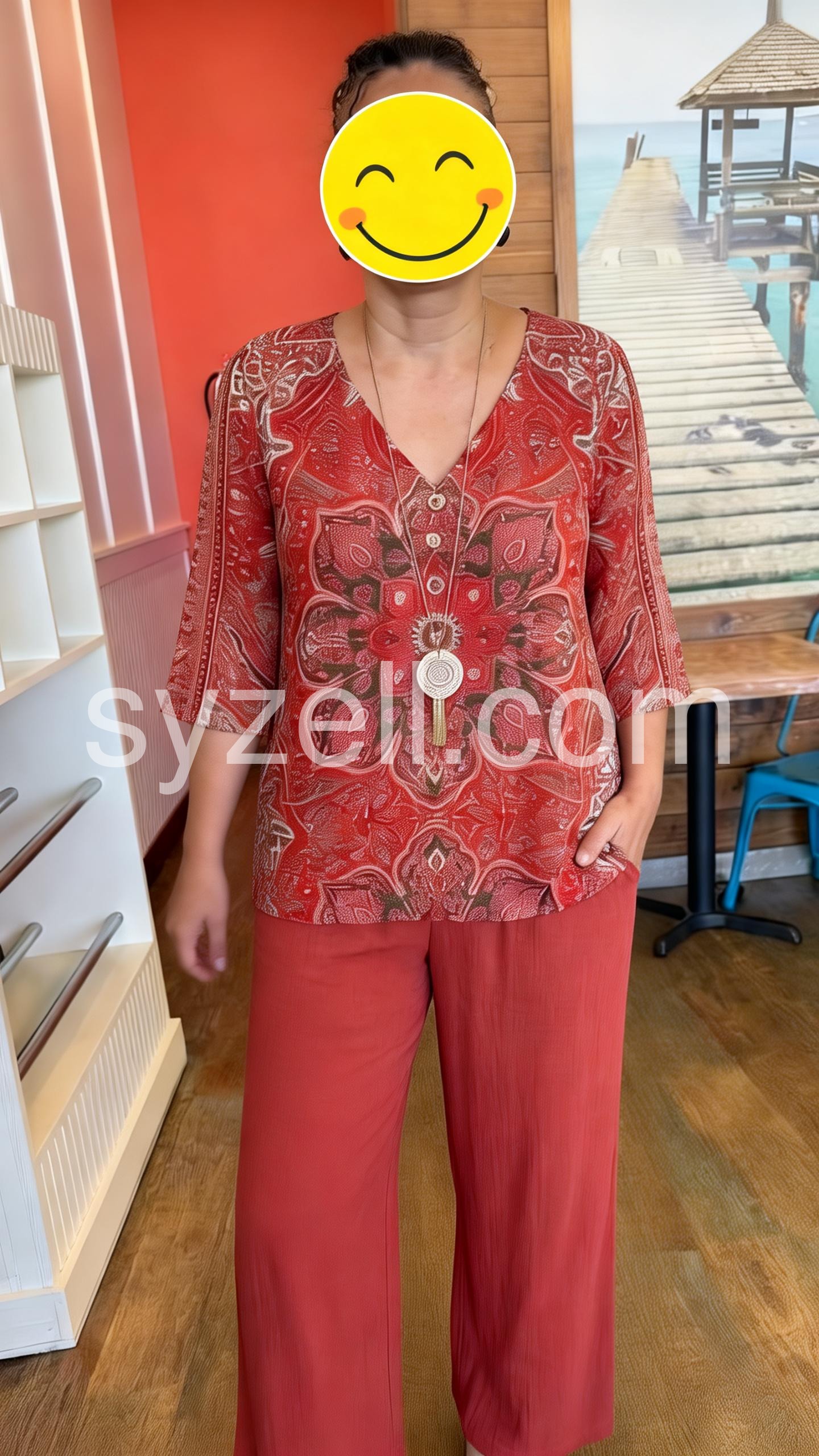 This coordinated set features a V-neck top with a bold mandala print and matching solid wide-leg pants. The relaxed fit ensures all-day comfort. Soft fabric perfect for warm weather. Ideal for casual outings or stylish days out. Effortlessly chic with a bohemian flair.