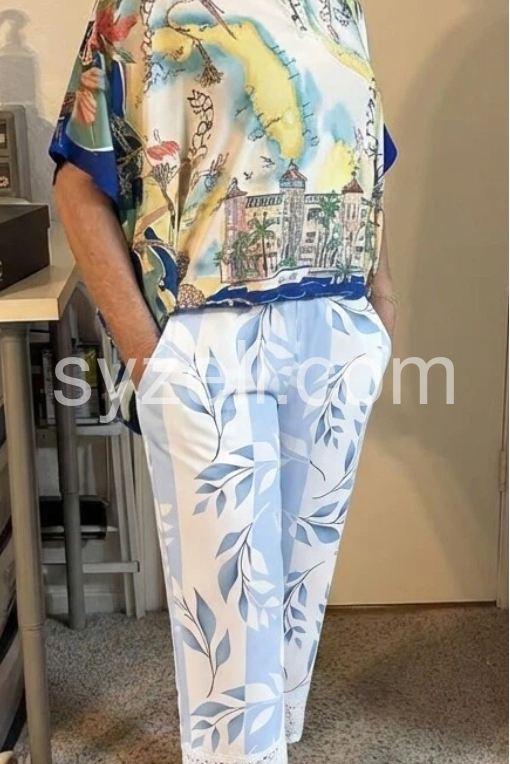 These flowy wide-leg pants feature a soft blue and white leaf pattern with a delicate lace hem. Elastic waistband and side pockets for comfort. Lightweight fabric perfect for warm days. Ideal for beachwear or casual summer styles. Elegant and breezy design.