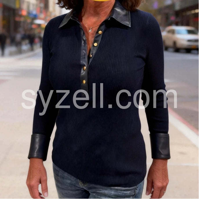 Chic Long Sleeve Faux Leather Trim Slim Fit Top