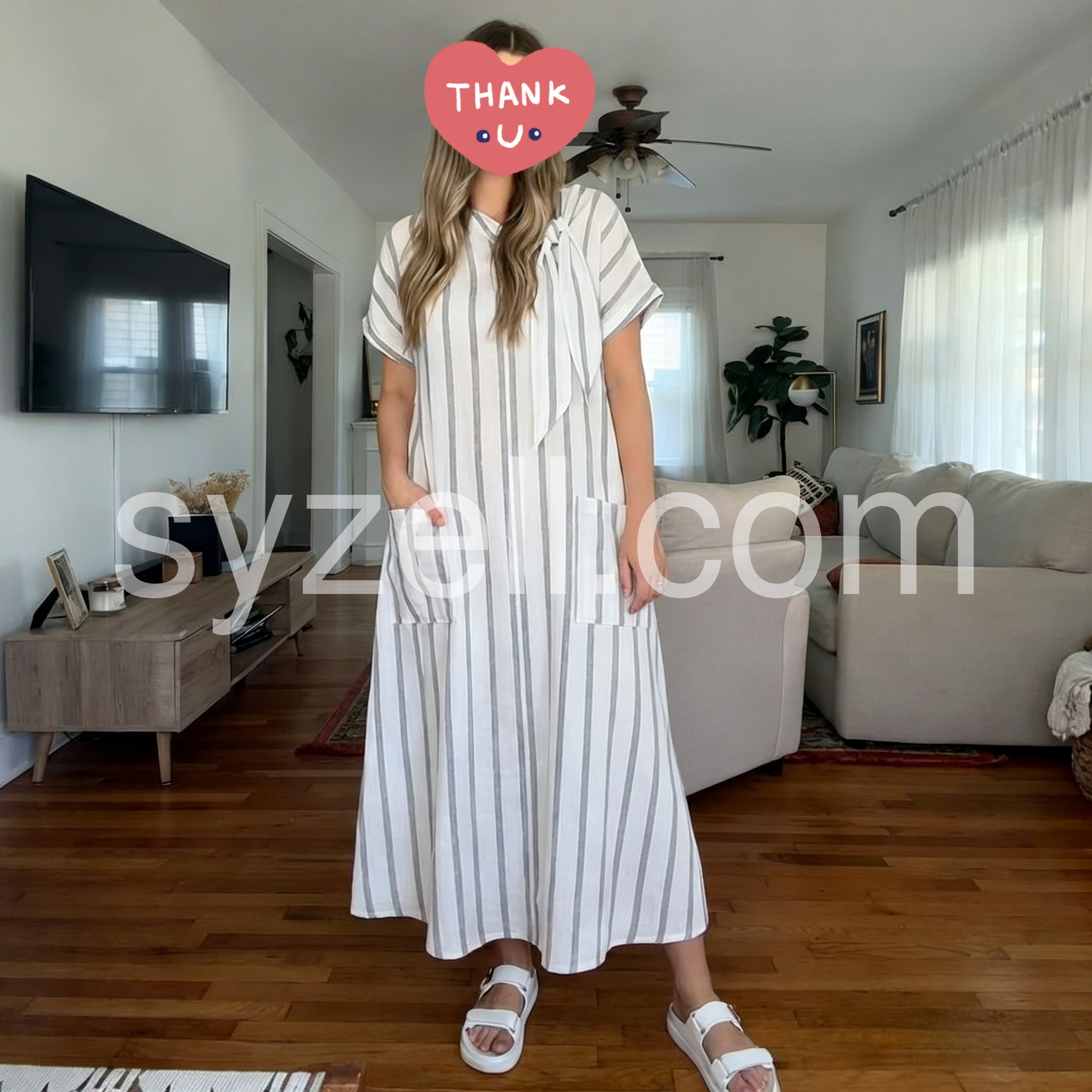 The classic vertical stripe print, twisted neck detail, and oversized pockets create a relaxed, stylish silhouette.