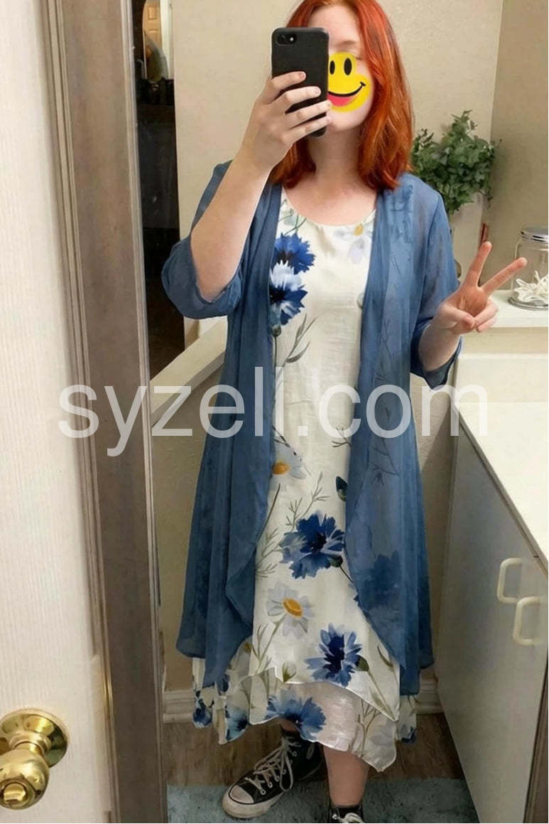 Style# 1544476Discover the perfect blend of comfort and elegance in this Elegant Blue Floral Print Maxi Dress With Jacket, a chic two-piece ensemble that captures the essence of relaxed summer sophistication. The dress features a soft, flowing silhouette crafted from lightweight, breathable fabric—likely cotton or linen blend—with a white base adorned by a watercolor-inspired floral print of bold blue cornflowers, delicate daisies, and green stems, evoking a garden-in-bloom aesthetic. Its sleeveless design and asymmetrical hem add modern flair, while the relaxed fit ensures all-day comfort. Paired with a long, open-front denim duster cardigan in a soft chambray blue, the look is elevated with effortless style—perfect for layering on breezy days or adding a touch of casual polish. Styled here with platform sandals, layered necklaces, and statement sunglasses, it’s ideal for brunch dates, garden parties, or leisurely walks through charming neighborhoods.
