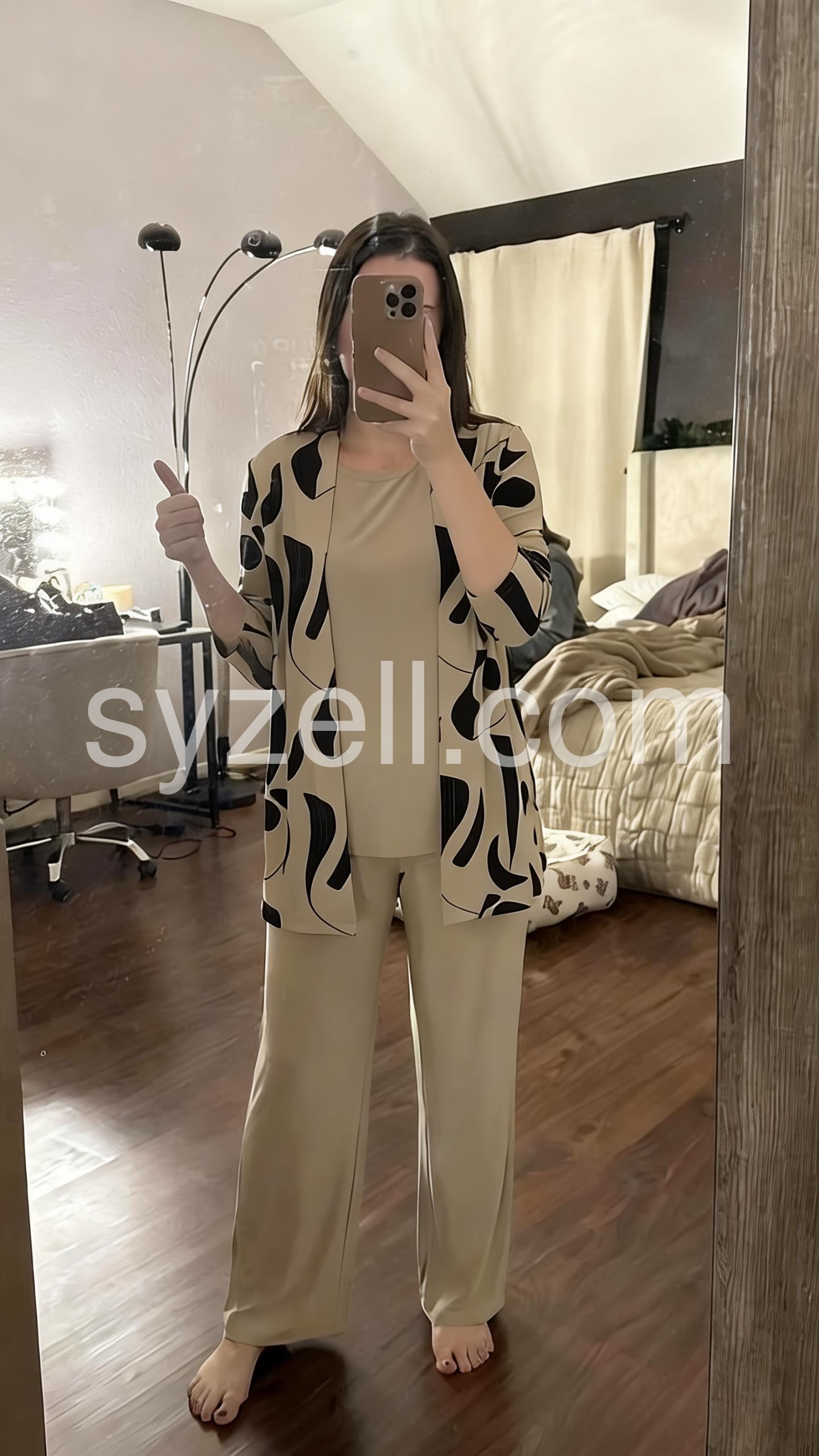 I was hesitant to buy clothing online, but this set exceeded my expectations. The taupe color is stunning and very neutral. The wide leg pants are flowy and do not cling to my thighs. It feels like wearing pajamas but looks incredibly chic for the office.