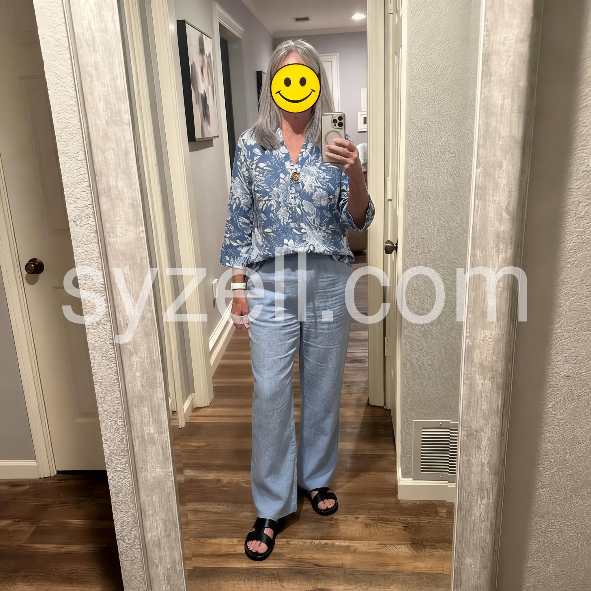 Such a comfortable two-piece set. The pants are roomy and flowy, like a soft linen blend, and the top fits beautifully without being clingy. It is my new go-to outfit for summer weekends.