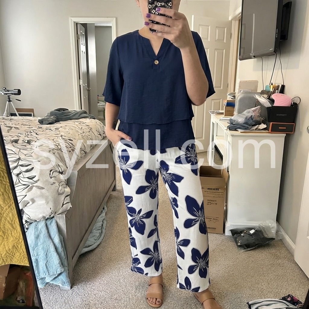 This outfit is a head-turner. The contrast between the solid dark blue top and the bold flower pattern on the pants is stunning. It feels like high-end boutique clothing but at a fraction of the cost. Super comfy for all-day wear.
