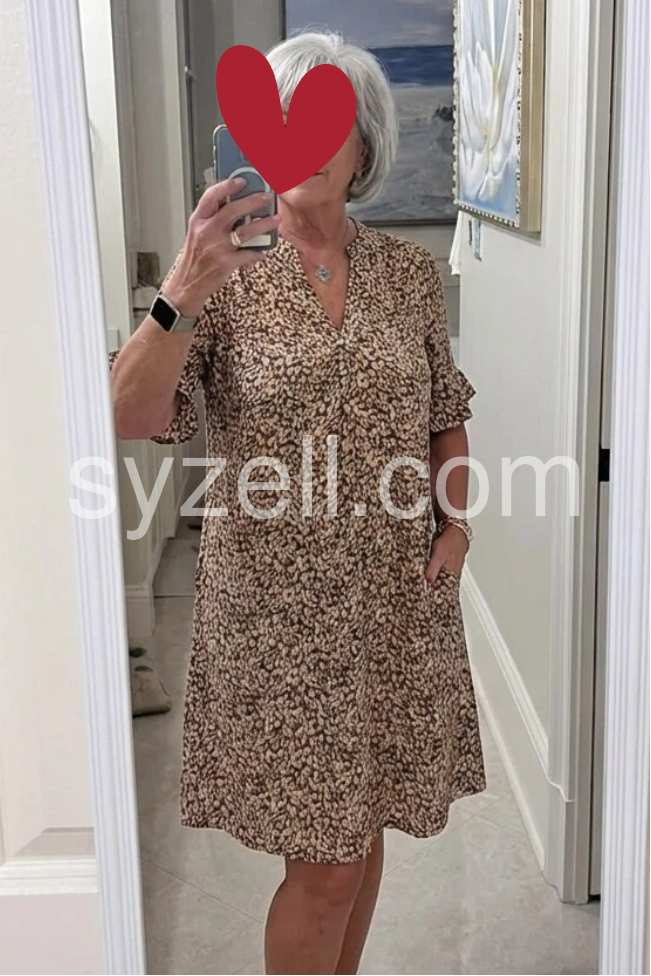 This min-length wrap dress features a soft, abstract floral print in neutral tones. V-neckline with flared short sleeves for a feminine touch. Flowy silhouette perfect for warm weather. Ideal for casual outings or brunch dates. Stylish and effortless elegance.