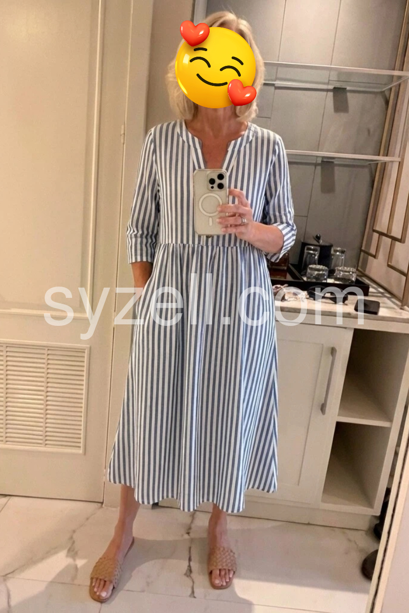 This button-front midi dress features vertical blue and white stripes. The V-neck and three-quarter sleeves offer a classic look. Side pockets add practicality and comfort. Lightweight fabric perfect for summer days. Ideal for beach outings or casual wear.