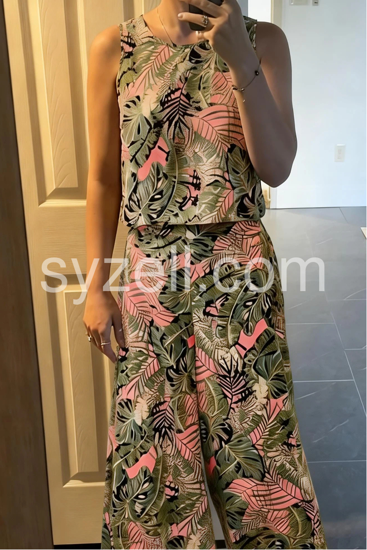 This coordinated set features a sleeveless crop top and wide-leg pants in a bold tropical leaf print. The mix of green, pink, and black creates a lively summer vibe. Lightweight fabric for comfort and ease. Perfect for beach days or casual outings. Effortlessly stylish with a nature-inspired flair.